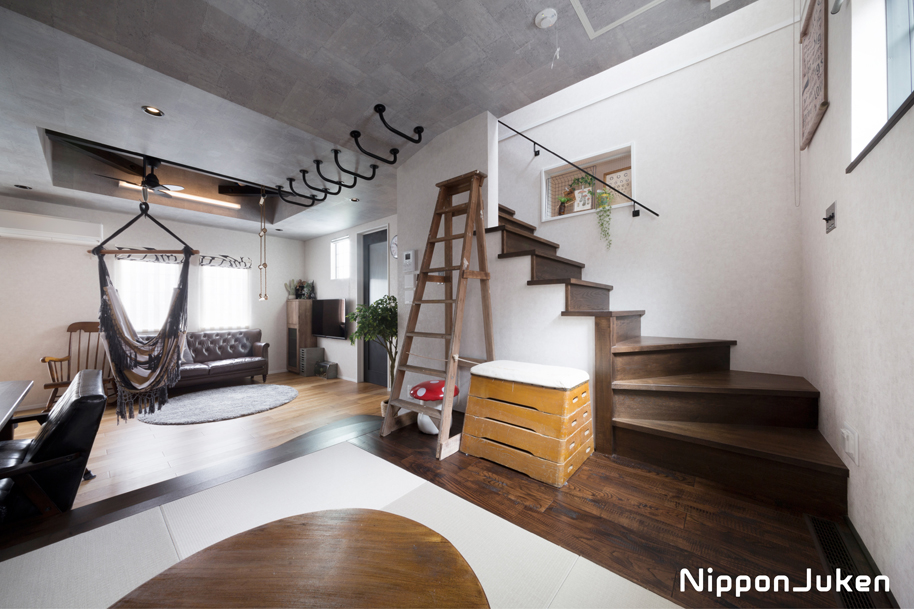 LDKにボルダリング壁面・雲梯・吹き抜けから登りロープを設置して、屋内公園的要素を出しました。