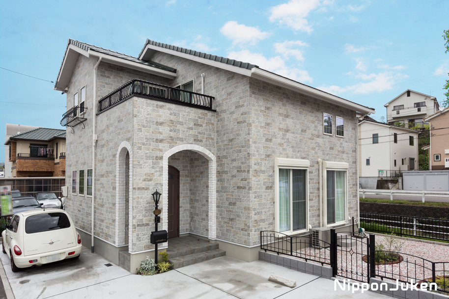 グレーのレンガ調のサイディングを用いた重厚な外観。