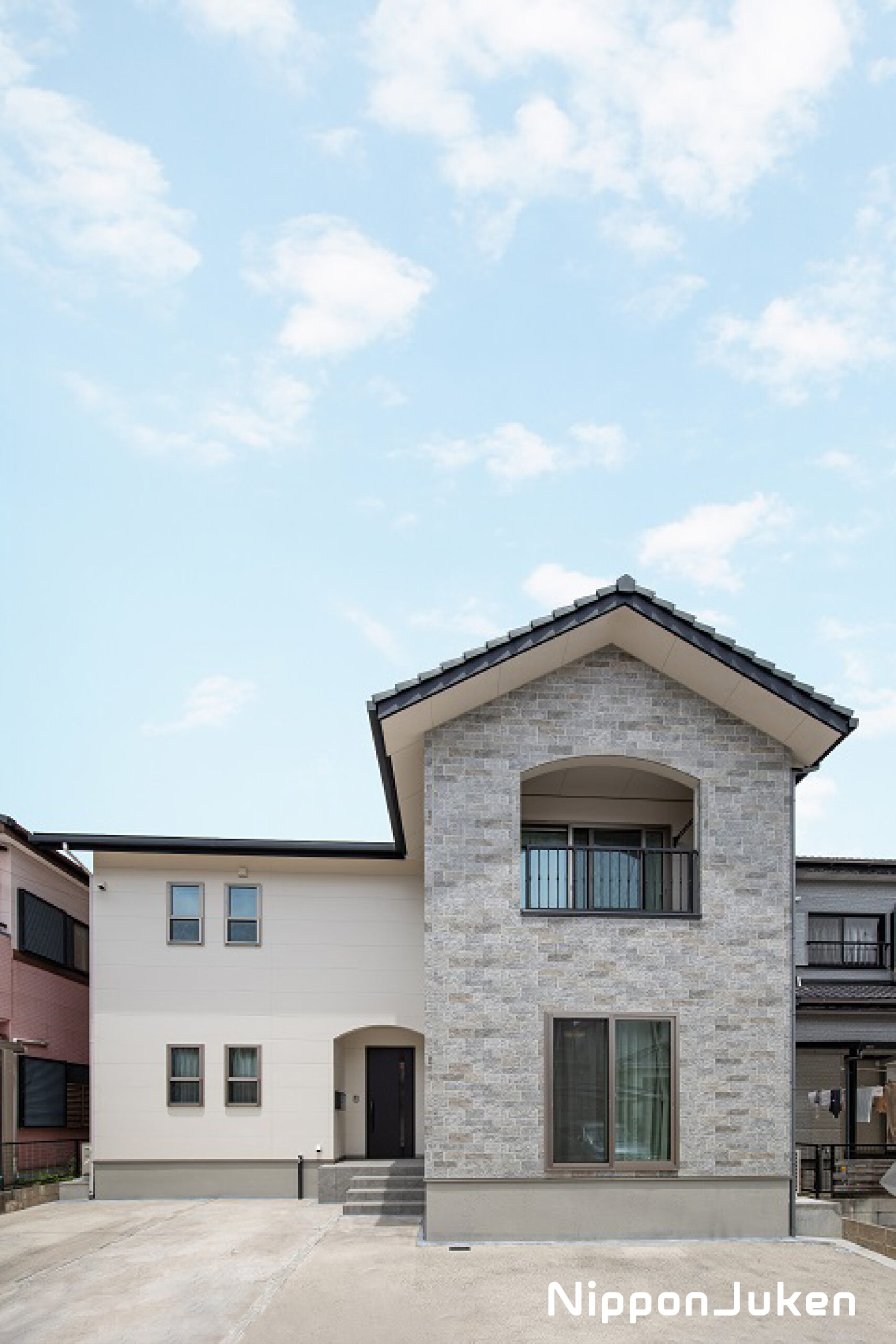 明るめのグレーのアクセントサイディングに、黒のアイアンが映えます。