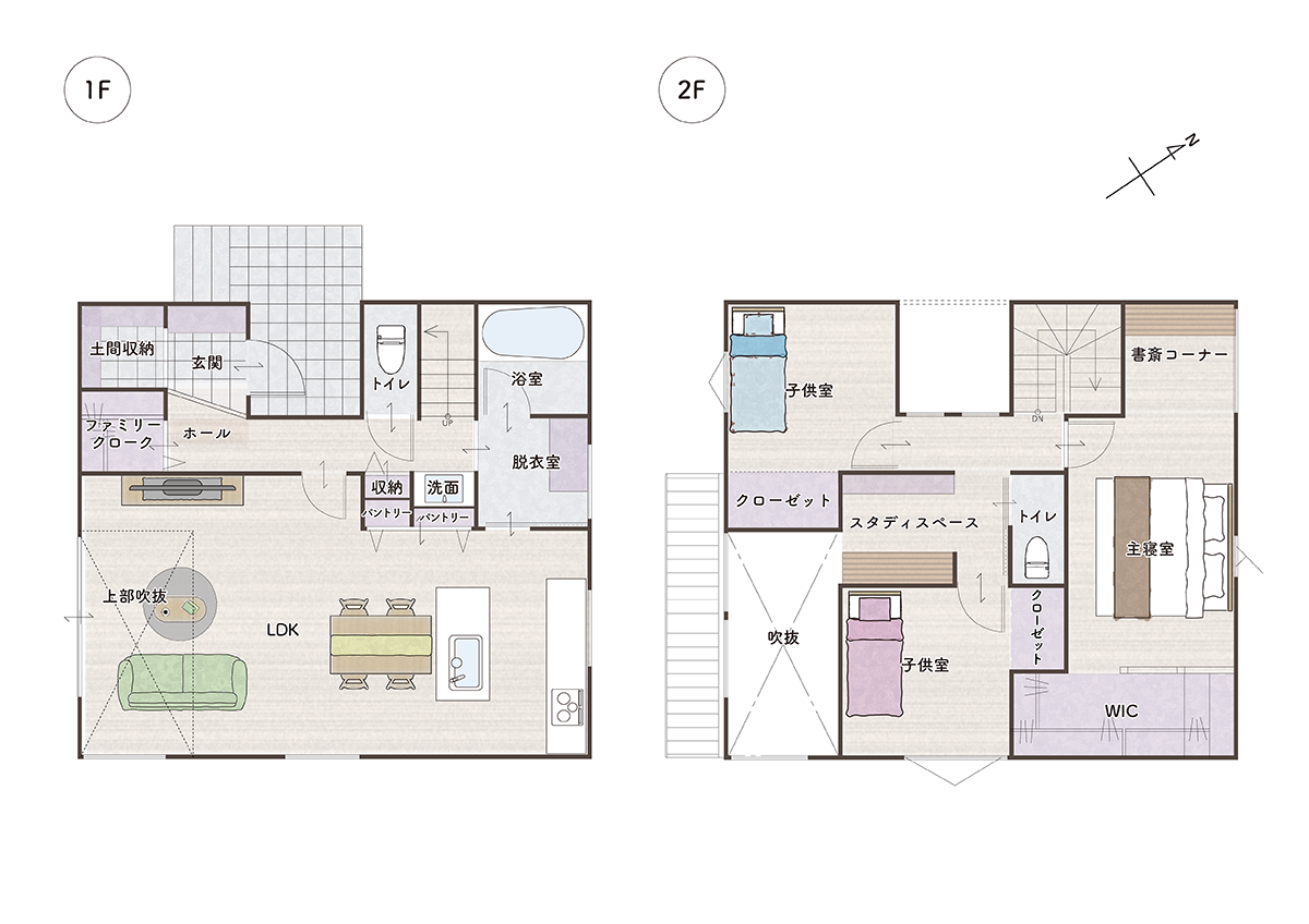 2歳と0歳の小さなお子様がいらっしゃるS様。安心してお子様と暮らすことができるよう、ご家族の存在が感じられる間取りに。