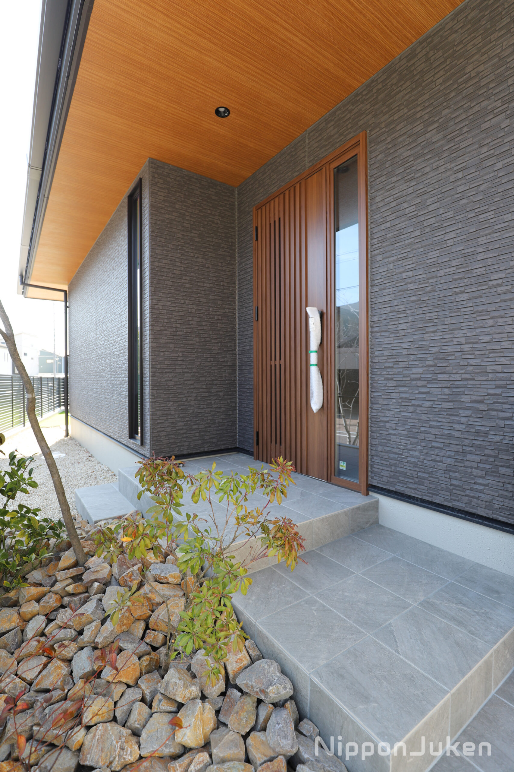 軒天を木目調にすることで、外壁とのコントラストを強調しています。